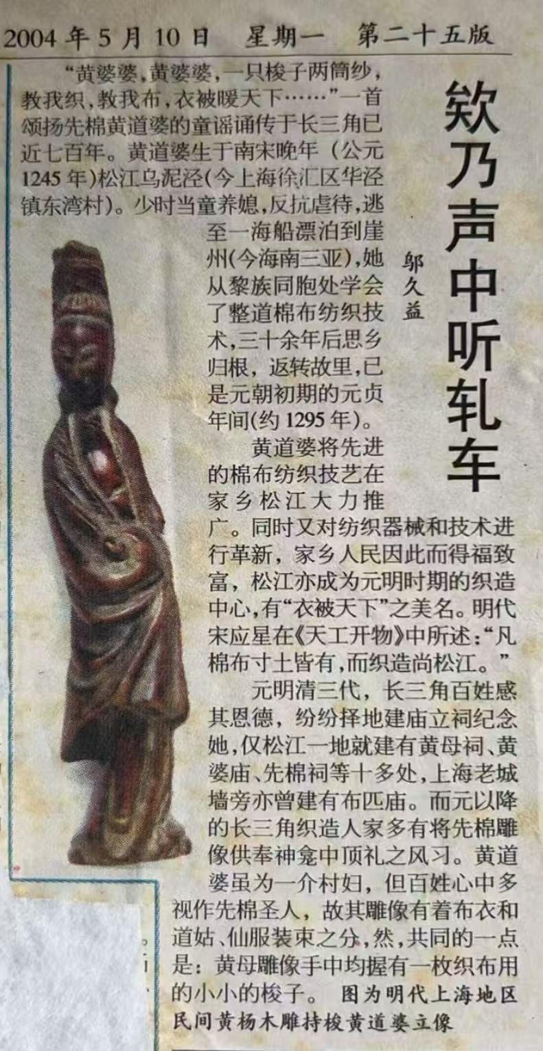 “黄婆婆,黄婆婆,一只梭子两筒纱, 教我织,教我布,衣被暖天下……”一首颂扬先棉黄道婆的童谣诵传于长三角已近七百年。黄道婆生于南宋晚年(公元1245年)松江乌泥泾(今上海徐汇区华泾镇东湾村)。少时当童养媳,反抗虐待,逃